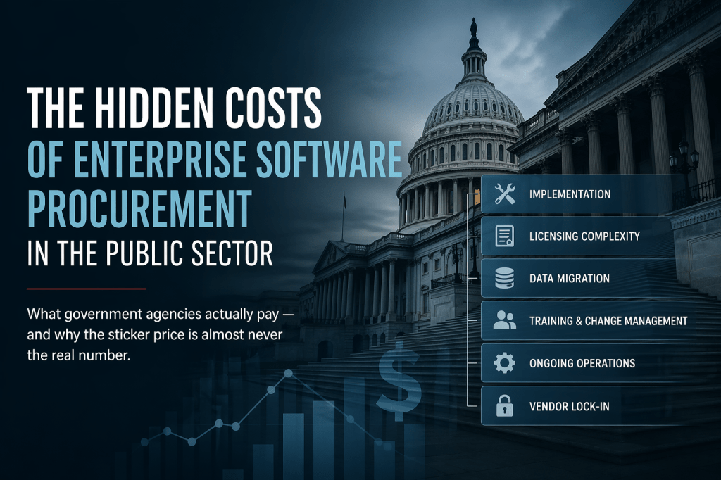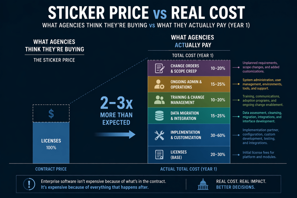 When a federal agency signs a contract for a new enterprise software platform, the number in the press release is almost never the number that matters. After a decade embedded inside those procurement processes — at the U.S. Department of State, the National Institutes of Health, and DISA — I watched agencies consistently underestimate what they were actually buying. Not because the procurement officers were careless. Because the real costs aren’t in the contract.