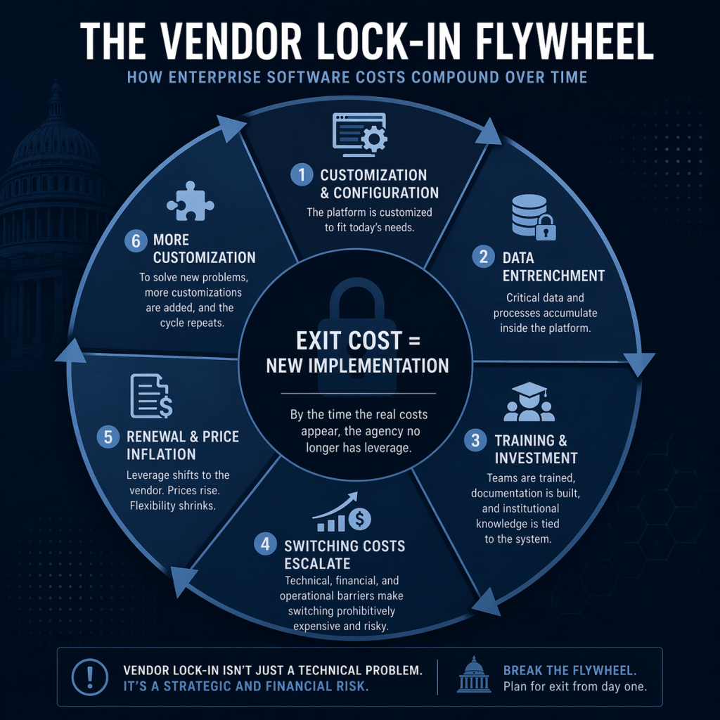 Procurements labeled as “competitive” are often written in ways that guarantee the incumbent wins. Once an agency has configured a major enterprise platform, migrated its data into that platform’s proprietary schema, and trained its staff on that platform’s workflows, the practical cost of switching vendors is enormous — often comparable to a new implementation. Vendors price their renewals accordingly.